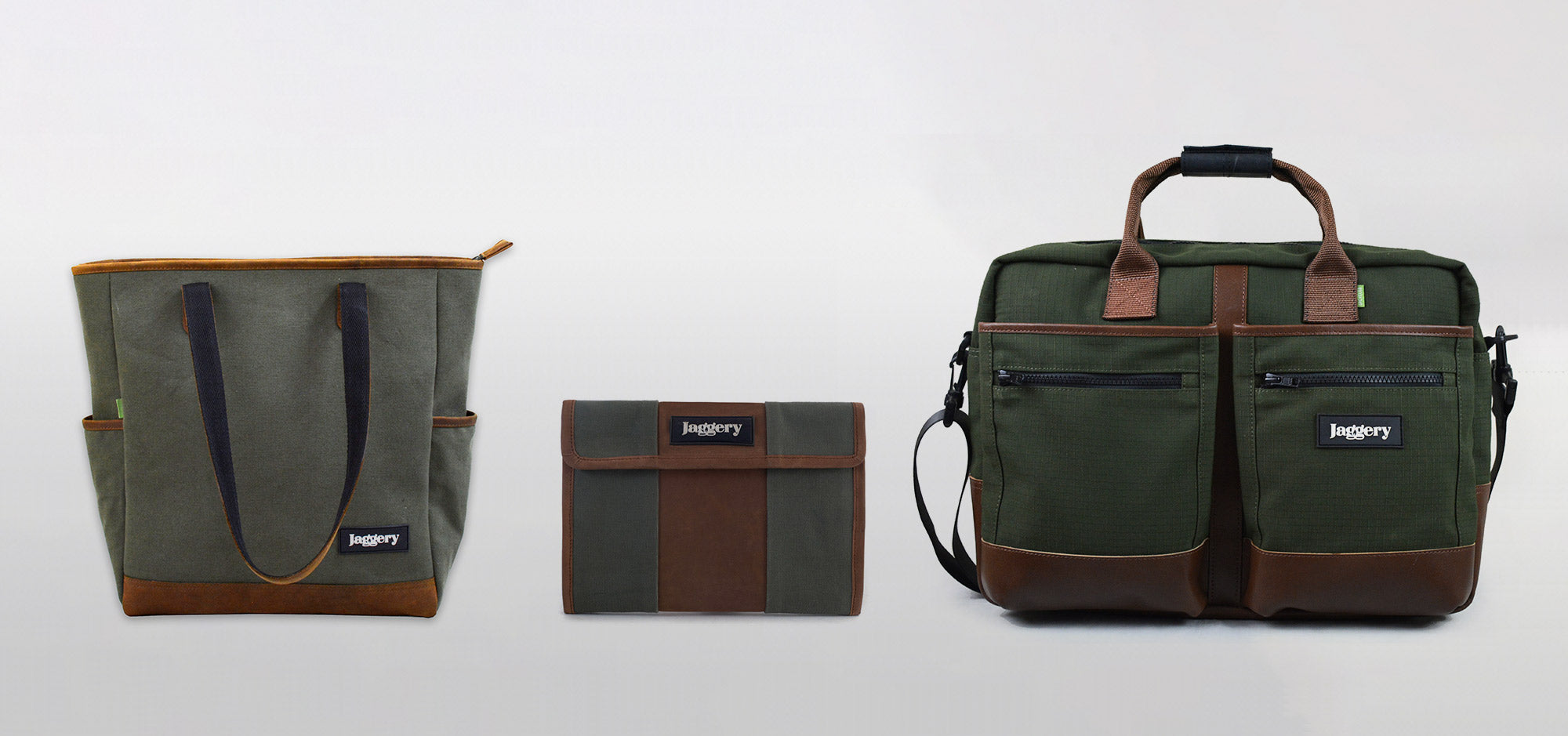 Olive green discarded army canvas joins forces with black rescued seat belts and salvaged leather for an adventurous collection.