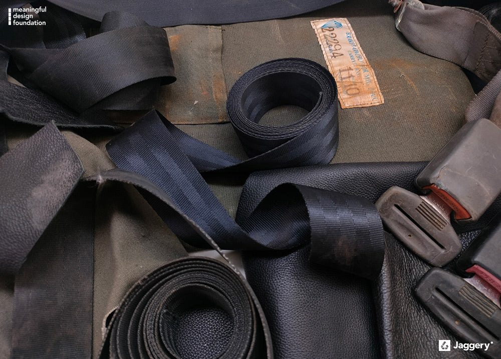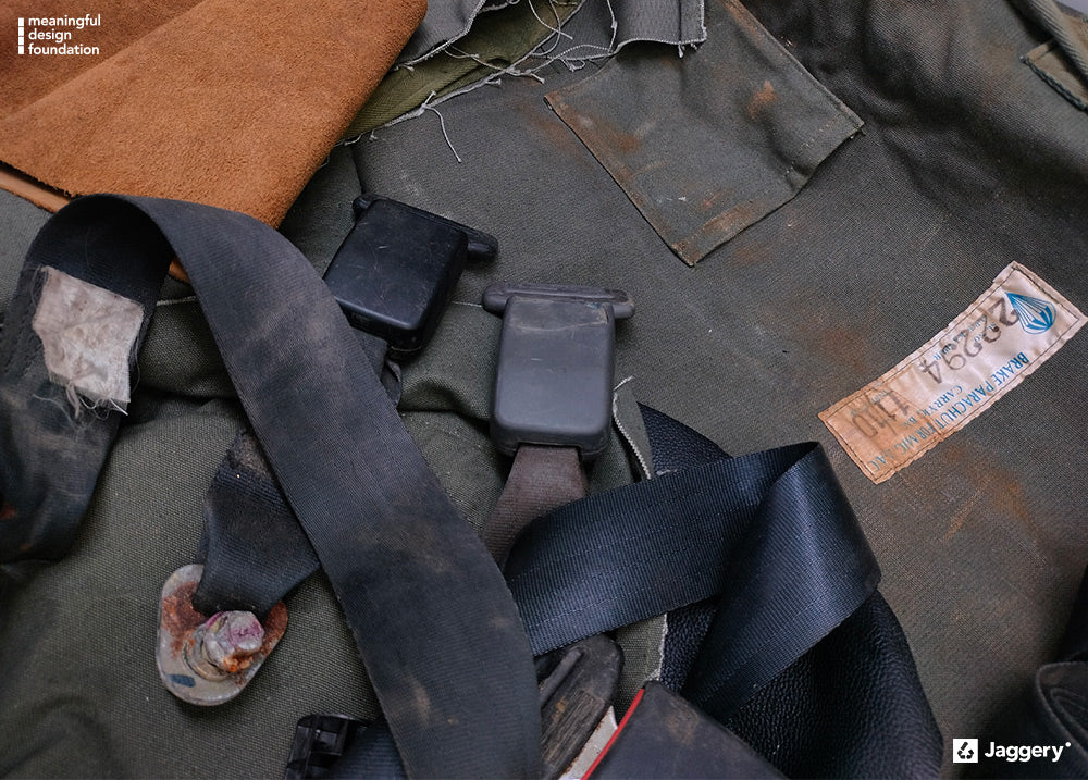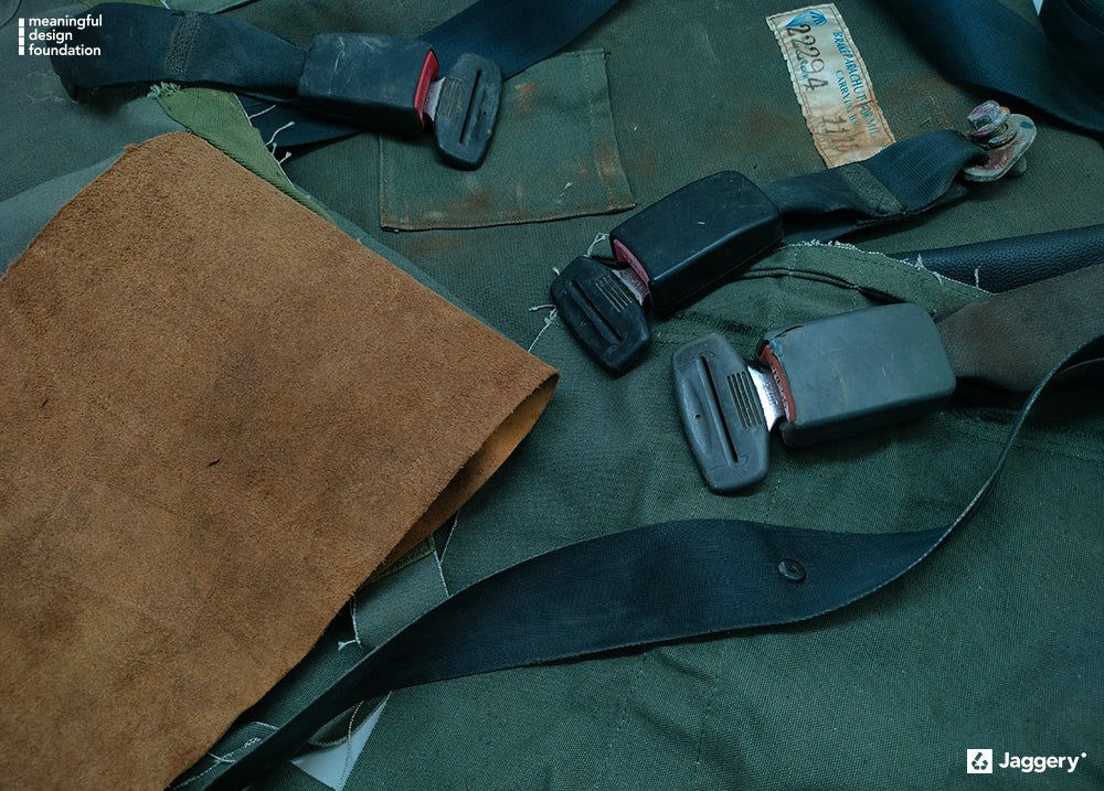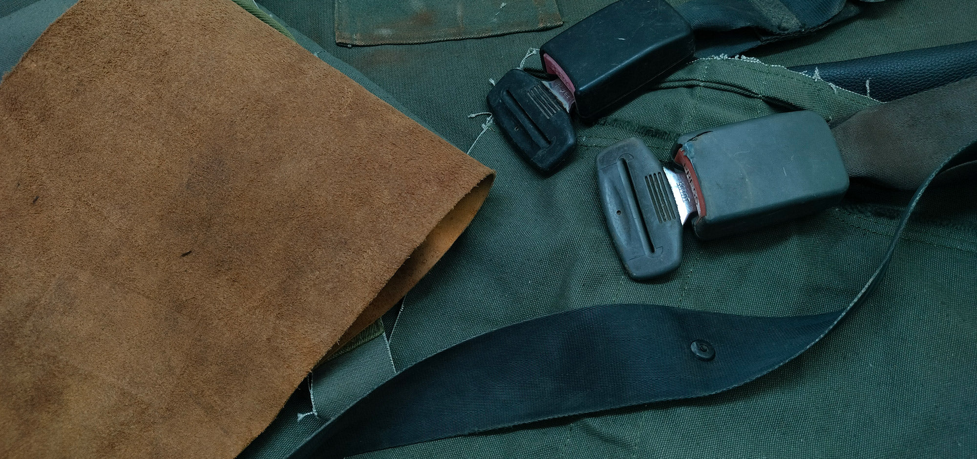 Ex-army canvas, rescued car seat belts and salvaged leather