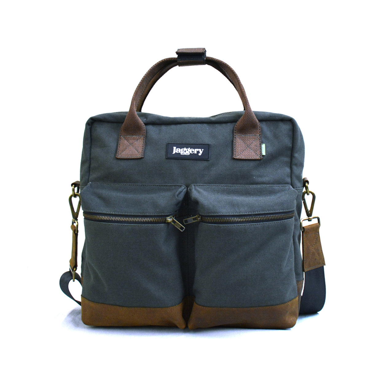 Crafted with precision, it combines ex-army olive green canvas, rescued car seat belts, and salvaged leather to create unique and durable bags.