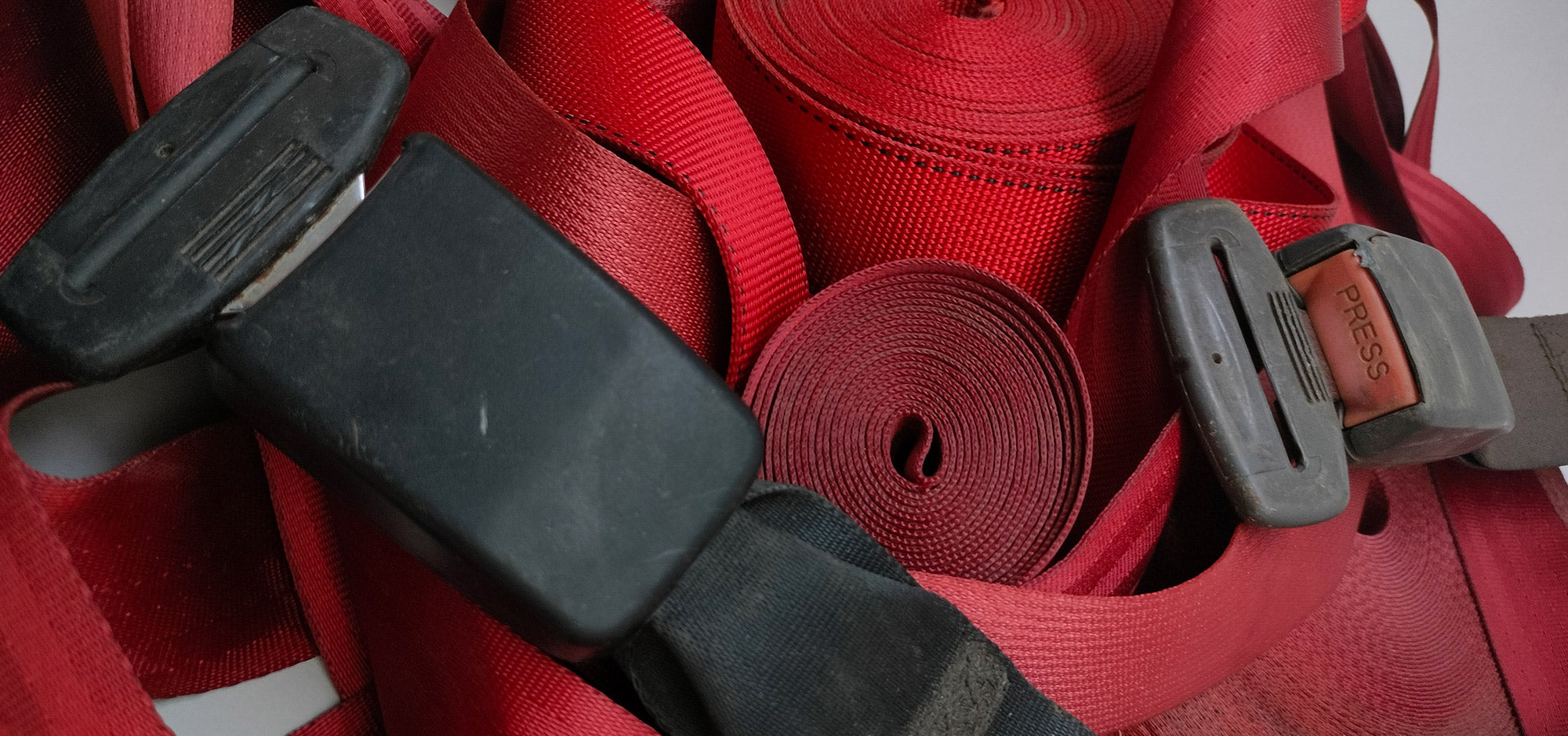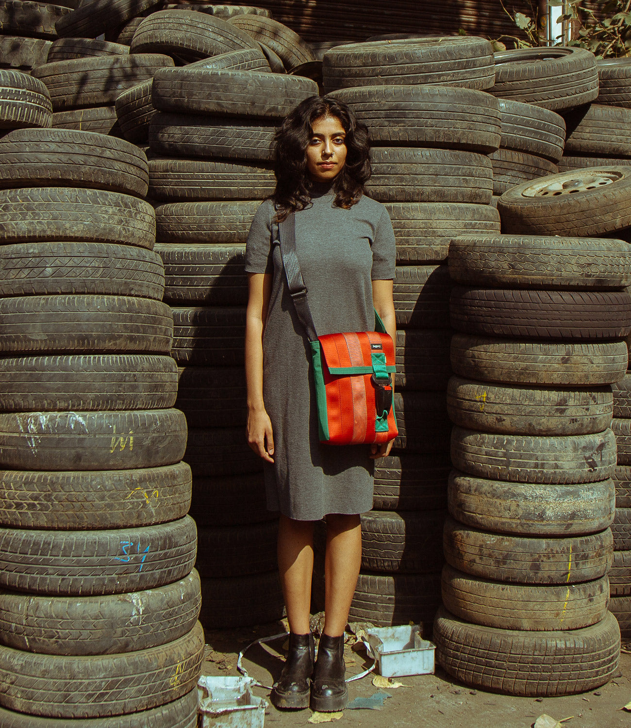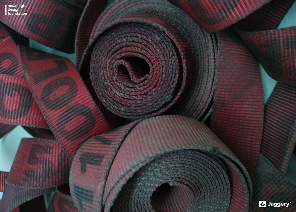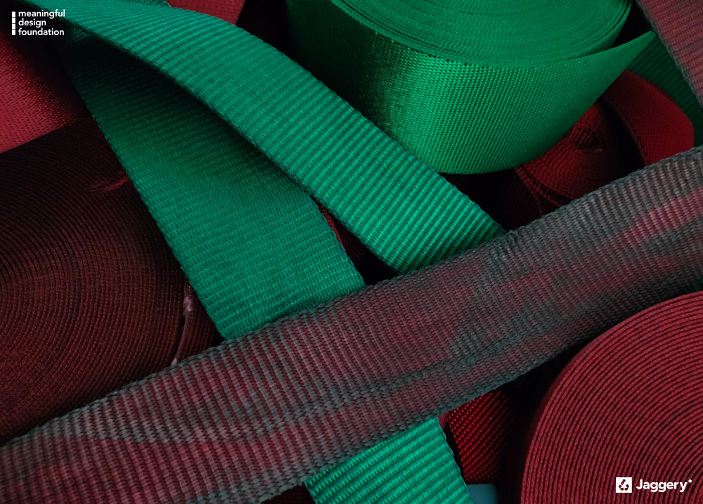Decommissioned green and red cargo belts, paired with black rescued seat belts, to carry stories of transformation and celebrate the spirit of sustainability.