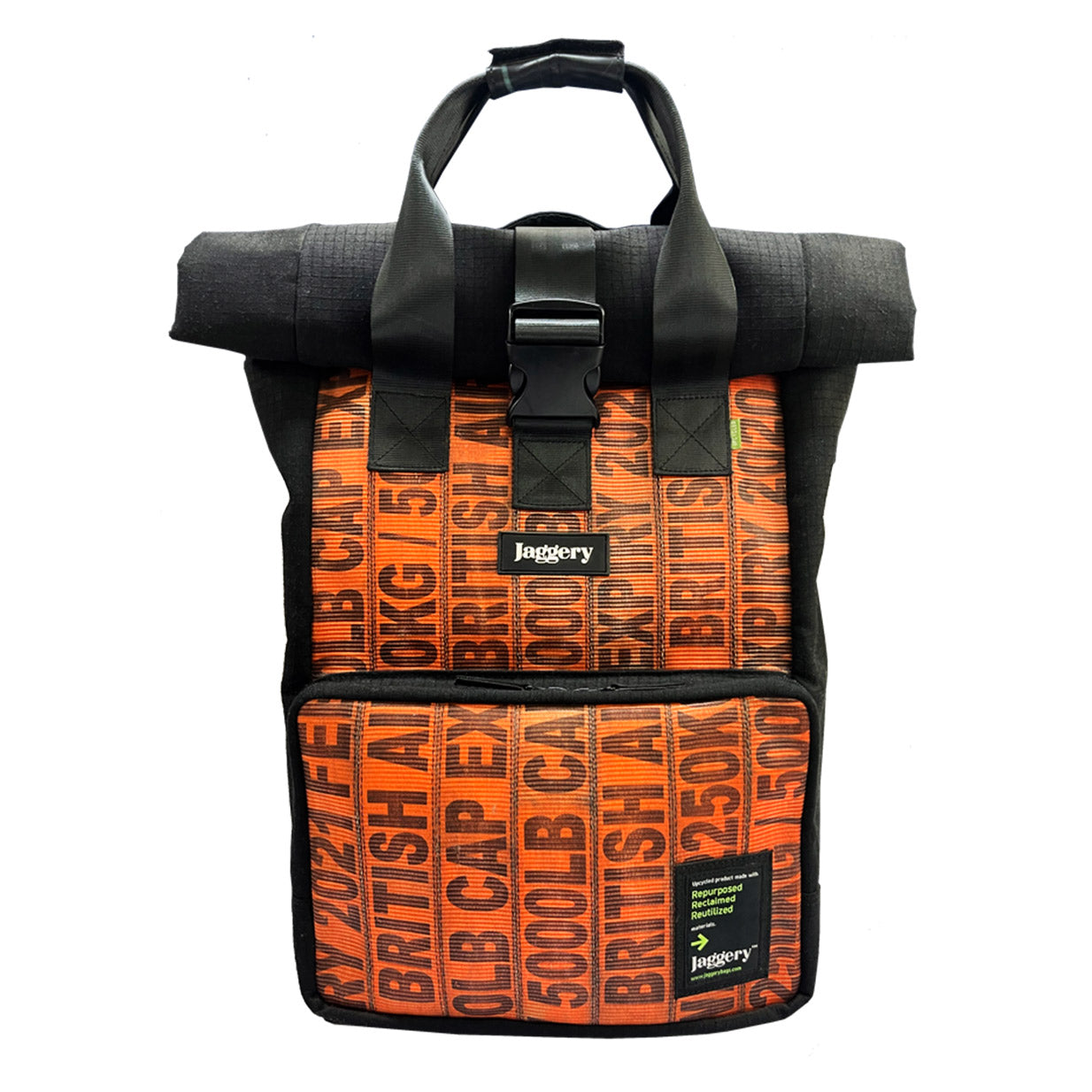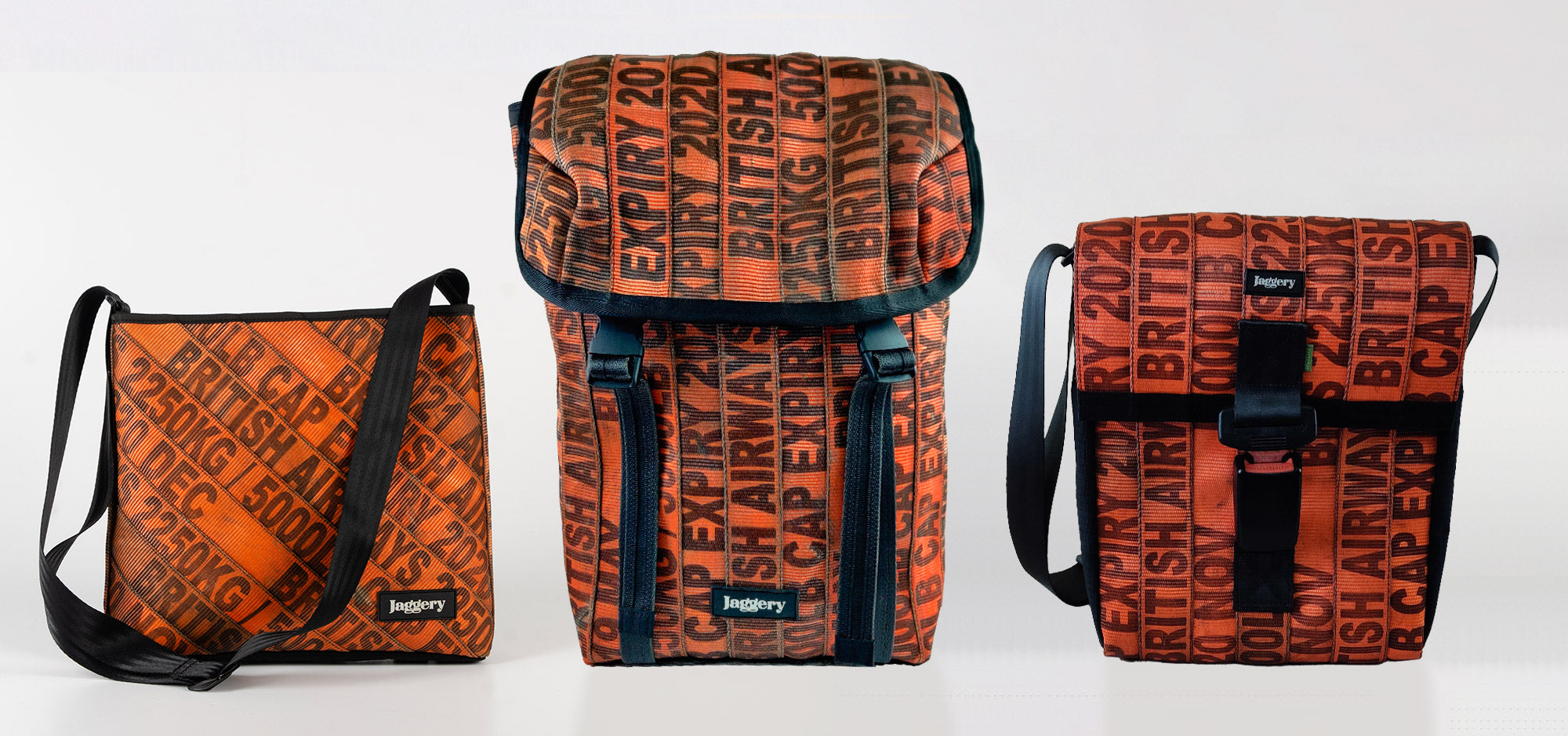 Stylish and durable gear crafted from decommissioned orange cargo lashing belts, sourced from mixed airlines and shipping yards.