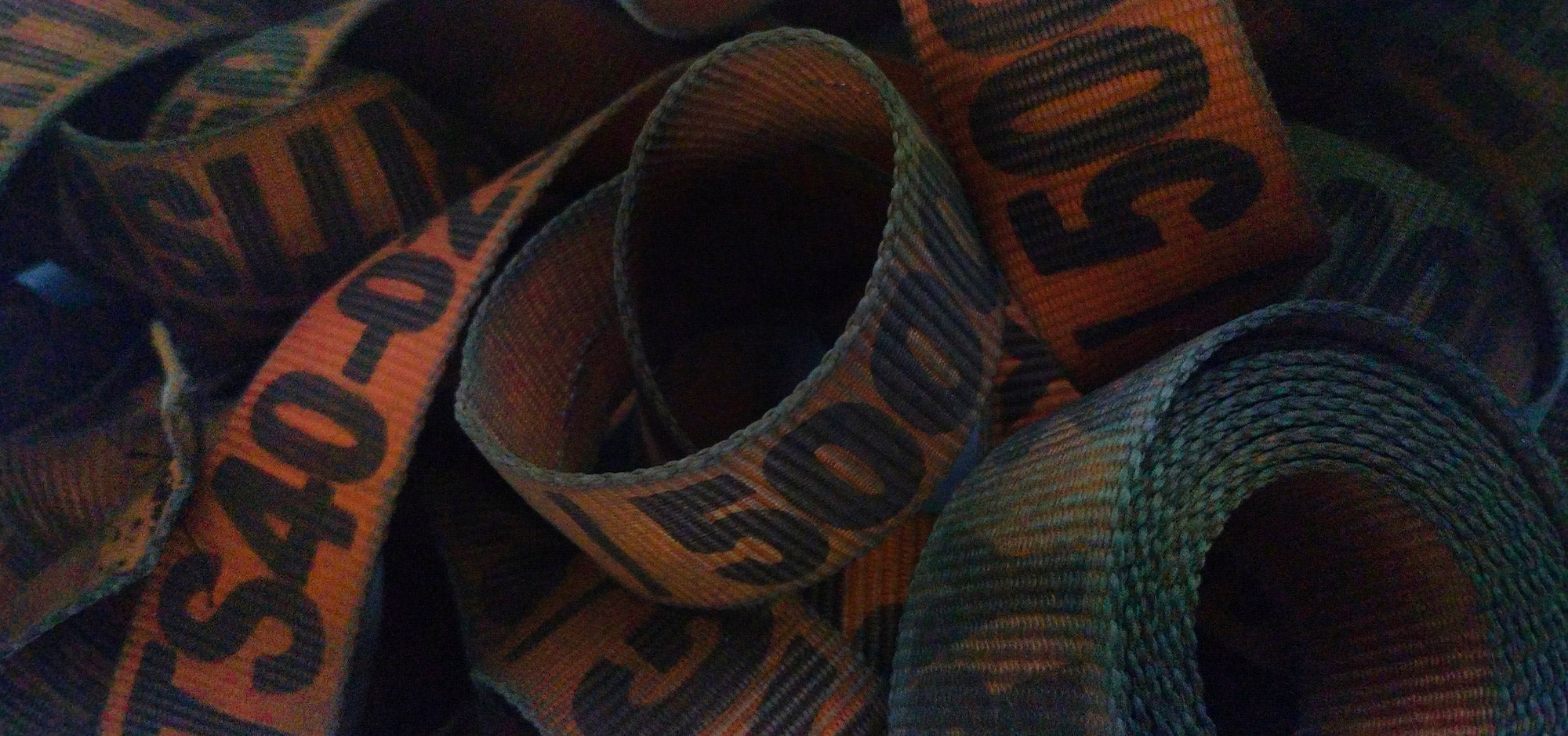 A vibrant mix of orange cargo belts, black rescued seat belts, and ex-army canvas that redefine recycling.